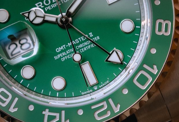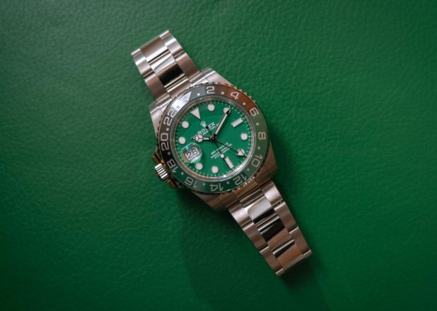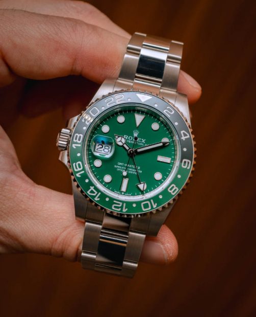 Since stainless steel and white gold can look somewhat similar at a quick glance, AAA replica Rolex watches often pairs its white gold models with bezels or dials that visually separate them from their more humble stainless steel counterparts. For example, the white gold version of the red and blue GMT-Master II “Pepsi” is currently only available with the option of either a blue dial or one crafted from meteorite (neither of which is available for the stainless steel “Pepsi” model), and the white gold Submariner is fitted with a blue bezel, which isn’t a color that appears on any of the stainless steel models from the collection. Rolex doesn’t want to make a white gold watch that is otherwise completely identical to one that is crafted from stainless steel, and the white gold version of the black and green left-handed GMT-Master II would therefore naturally be fitted with a matching green dial.