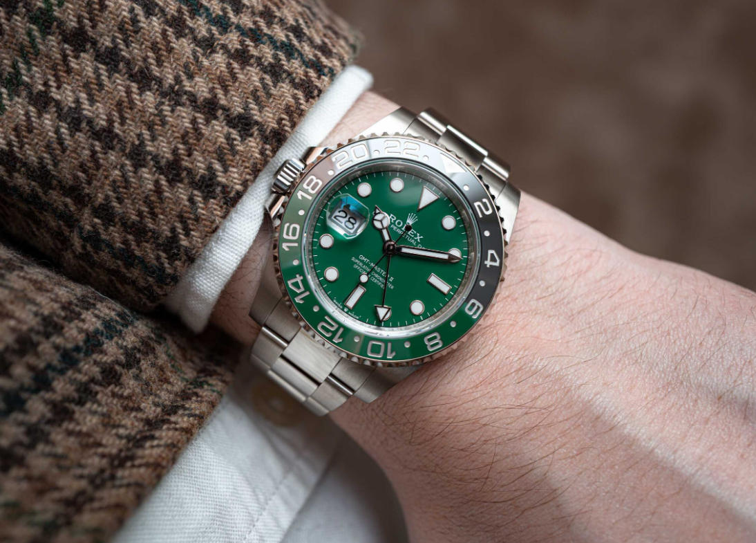 Since stainless steel and white gold can look somewhat similar at a quick glance, AAA replica Rolex watches often pairs its white gold models with bezels or dials that visually separate them from their more humble stainless steel counterparts. For example, the white gold version of the red and blue GMT-Master II “Pepsi” is currently only available with the option of either a blue dial or one crafted from meteorite (neither of which is available for the stainless steel “Pepsi” model), and the white gold Submariner is fitted with a blue bezel, which isn’t a color that appears on any of the stainless steel models from the collection. Rolex doesn’t want to make a white gold watch that is otherwise completely identical to one that is crafted from stainless steel, and the white gold version of the black and green left-handed GMT-Master II would therefore naturally be fitted with a matching green dial.