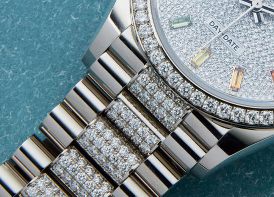 The best clone Rolex Day-Date 36 “rainbow” watches is available in Everose gold (ref. 128345RBR), white gold (ref. 128349RBR), and yellow gold (ref. 128348RBR). The Everose and white gold versions cost 121,100 Swiss francs; the yellow gold model costs is unavailable but it is slightly less.